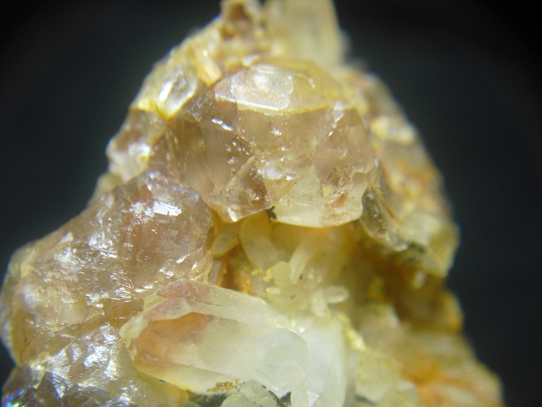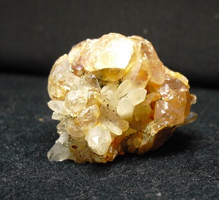 | 無〜淡ピンク色透明のほたる石。一部に結晶面を有していますが、全体的にルーズ。小さな水晶を伴っています。個々の結晶は一辺概ね7mm内外。 | |
