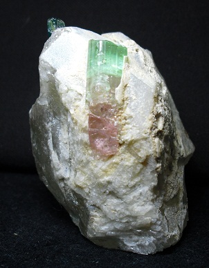 アフガニスタン産の母岩付きトルマリンです。透明な結晶、結晶の両端で色が異なるバイカラーとなっています。ピンクの部分は柱面が欠けているため結晶面は見られません。端面はありませんが、観察すると自然になくなったように見受けられます。太さは1cmほど、柱面部分の長さは1.5cmほどあります。 |
