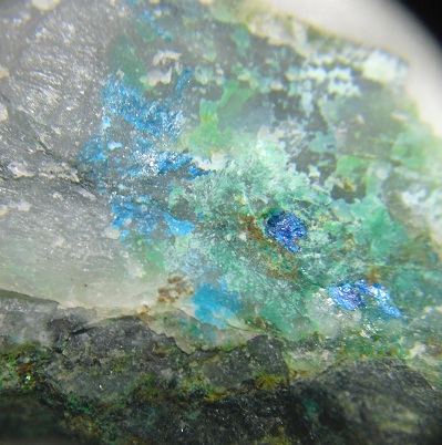 | 1982年に論文発表された日本産新鉱物。大和鉱山は野田玉川鉱山とともに原田石の原産地とされています。北大の鉱物学者「原田準平」氏にちなみ命名されました。バナジウムを含み美しい緑色の鉱物。一番右側の画像の本鉱で1mmほどのサイズ(3,150円)。 | ||