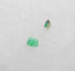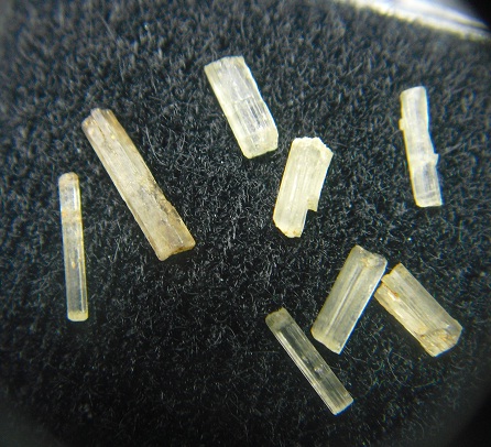 | 貯鉱のあとより篩掛けによって得られた緑柱石の分離品のセットです。黄色味がかった透明〜半透明の柱状結晶。長さは最大で8mm程度。 |