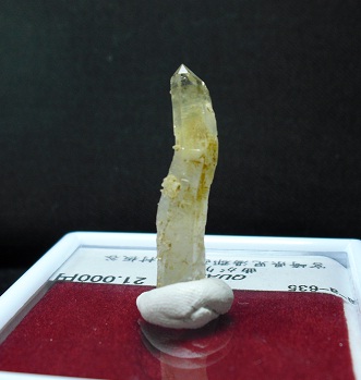 曲がり水晶を多く産出することで知られる板谷の曲がり水晶。ふつうは一か所で曲がるだけですので、弓なり状に反っているのですが、この標本は二か所で曲がっているため、ルーズながらS字型となっています。 |